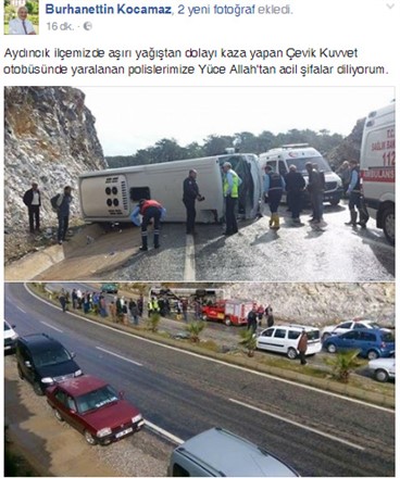 Kazanın ardından Mersin Büyükşehir Belediye Başkanı Burhanettin Kocamaz Resmi sosyal medya hesabından yayınladığı mesajda :"Aydıncık ilçemizde aşırı yağıştan dolayı kaza yapan Çevik Kuvvet otobüsünde yaralanan polislerimize Yüce Allah'tan acil şifalar diliyorum." dedi.
