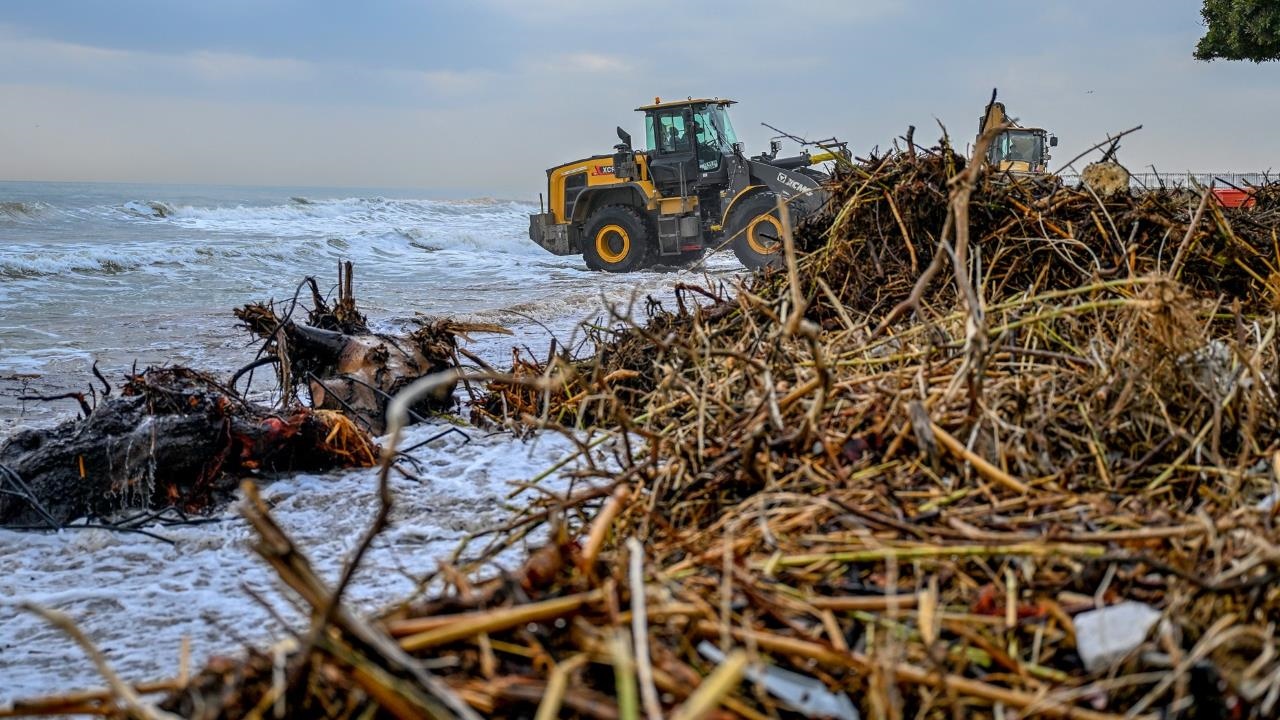 Mezitli ilçesi Tece sahili ile Akdeniz ilçesi Kazanlı sahili arasını kapsayan bölgede sel sularının sürüklediği ağaç, odun, çakıl ve süprüntü atıkları ekiplerin koordineli çalışmasıyla temizleniyor.
