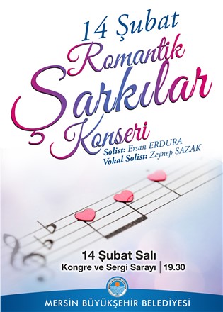 Bunun yanı sıra Mersinliler aşk şarkılarının seslendirileceği ‘14 Şubat Romantik Şarkılar Konseri’ ile bu özel günü kutlayacak. Saat 19:30’da Mersin Büyükşehir Belediyesi Kongre ve Sergi Sarayı'nda gerçekleştirilecek ‘14 Şubat Romantik Şarkılar Konseri'nde Ersan Erdura ve Zeynep Sazak sahne alacak.