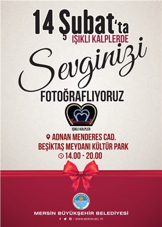 Kültür ve sanatın bir arada harmanladığı Mersin’de 14 Şubat yine çok özel etkinliklere sahne olacak. Büyükşehir Belediyesi, Sevgililer Günü'nde Adnan Menderes Caddesi Beşiktaş Meydanı Kültür Park içerisinde yer alan Işıklı Kalpler’de saat 14:00 ile 20:00 arasında ‘Sevginizi Fotoğraflıyoruz’ etkinliği ile tüm Mersinlilerin fotoğraflarını ücretsiz olarak çekecek.