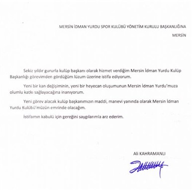 Kahramanlı, verdiği istifa dilekçesinde, "Yeni görev alacak kulüp başkanımıza maddi manevi yanında olarak Mersin İdman Yurdu Kulübü'müzü emrinde olacağım.