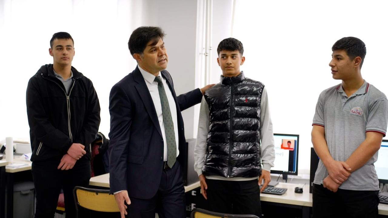 Nihal Erdem Ticaret Mesleki ve Teknik Anadolu Lisesinde okulun fiziki imkânlarını, laboratuvar ve atölyeleri inceleyen Muhammed Özdemirci, bilişim teknolojilerinin ve mesleki eğitimin öğrencilerin geleceği açısından önemine dikkat çekti.