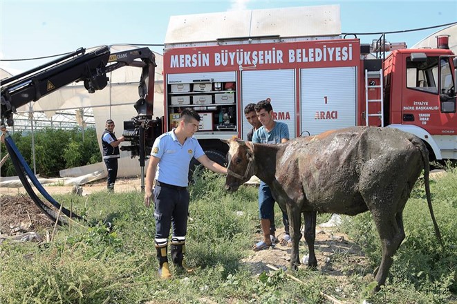 Sarı kızı düştüğü fosseptik çukurundan kendi imkanlarıyla çıkaramayan Atlı, Mersin Büyükşehir Belediyesi İtfaiye ekiplerinden yardım istedi. Olay mahaline giden Mersin İtfaiye ekipleri perlon ve vinç yardımı ile fosseptik çukuruna düşen ineği çıkarıp sahiplerine teslim etti.