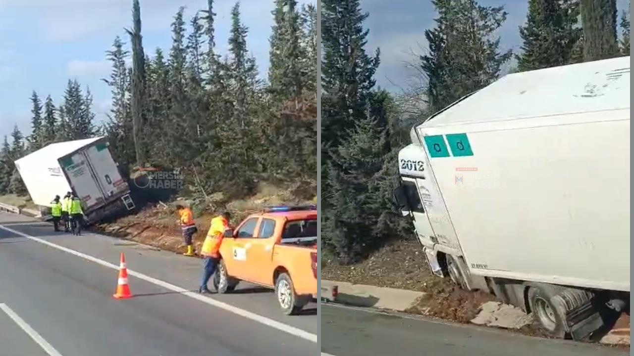 Edinilen bilgilere göre, sürücüsünün direksiyon hakimiyetini kaybettiği dev TIR, bir anda yoldan çıktı. Hızla yolun kenarındaki eğimli yeşil alana doğru savrulan araç, eğimli alanda asılı kaldı.