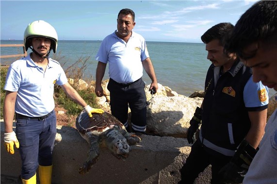 Mersin Büyükşehir Belediye'si İtfaiye ekiplerinin ve vatandaşların yardımı ile çıkarılan carettanın uzun süredir ölü olarak deniz içerisinde kaldıgı gözlemlendi.