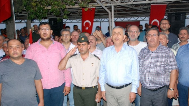 Silifke Kalesinde düzenlenen Demokrasi yürüyüşü etkinliğine katılan Binbaşı Ali Özcan, Silifke Kalesinin burçlarına asılan büyük Türk bayrağının altında bir dakikalık saygı duruşunda bulunduktan sonra İstiklal Marşını okudu.