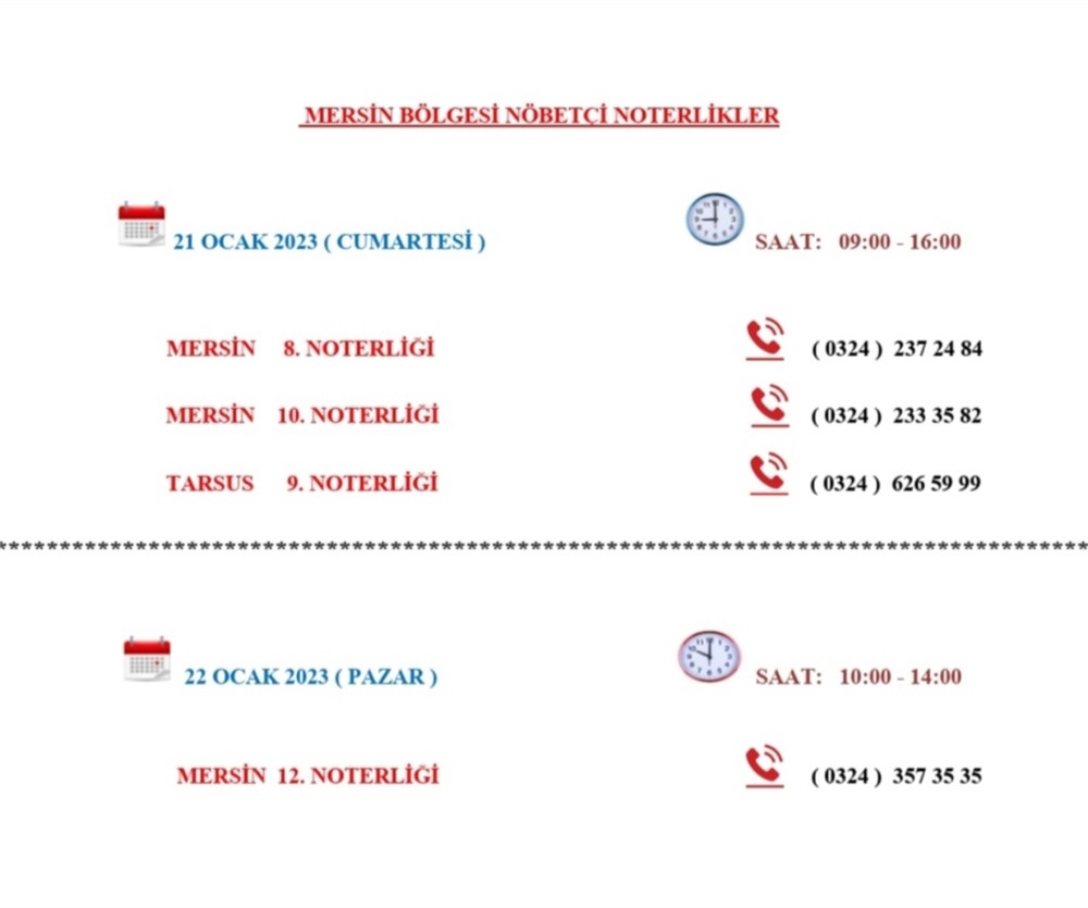 Bu hafta sonu 21-22 Ocak 2023 tarihinde Mersin'de nöbetçi olan noterler listesi;
