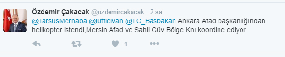 Öte yandan Mersin Valisi Özdemir Çakacak ise, sosyal medyada yaptığı açıklama da; "Ankara Afad başkanlığından helikopter istendi,Mersin Afad ve Sahil Güv. Bölge Komutanlığı koordine ediyor."şeklinde paylaşım yaptı.