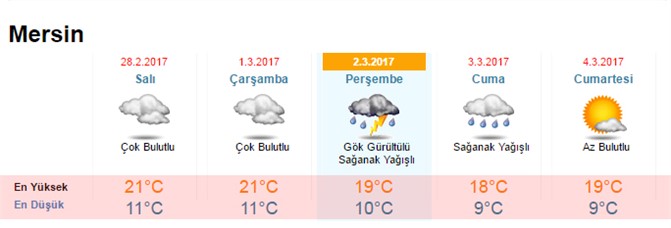 Meteoroloji Bölge Müdürlüğü'nden alınan bilgiye göre, Mersin'de hafta boyunca sıcaklık mevsim normallerinde seyredeceği ve Perşmebe ve Cuma günü ise yağışlı olacağı tahmin ediliyor.