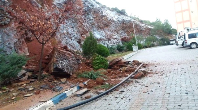 Mersin'in Anamur ilçesi TOKİ konutlarında, dağdan kopan kaya tehlike saçtı.