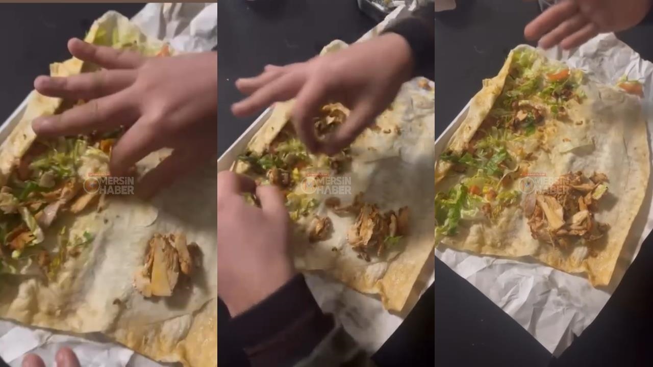 Büyük bir iştahla dürümünü açan müşteri, gördüğü manzara karşısında neye uğradığını şaşırdı. Dönerin içinden tavuk eti yerine sadece marul ve tavuk derisi çıkması sosyal medyada gündem oldu.