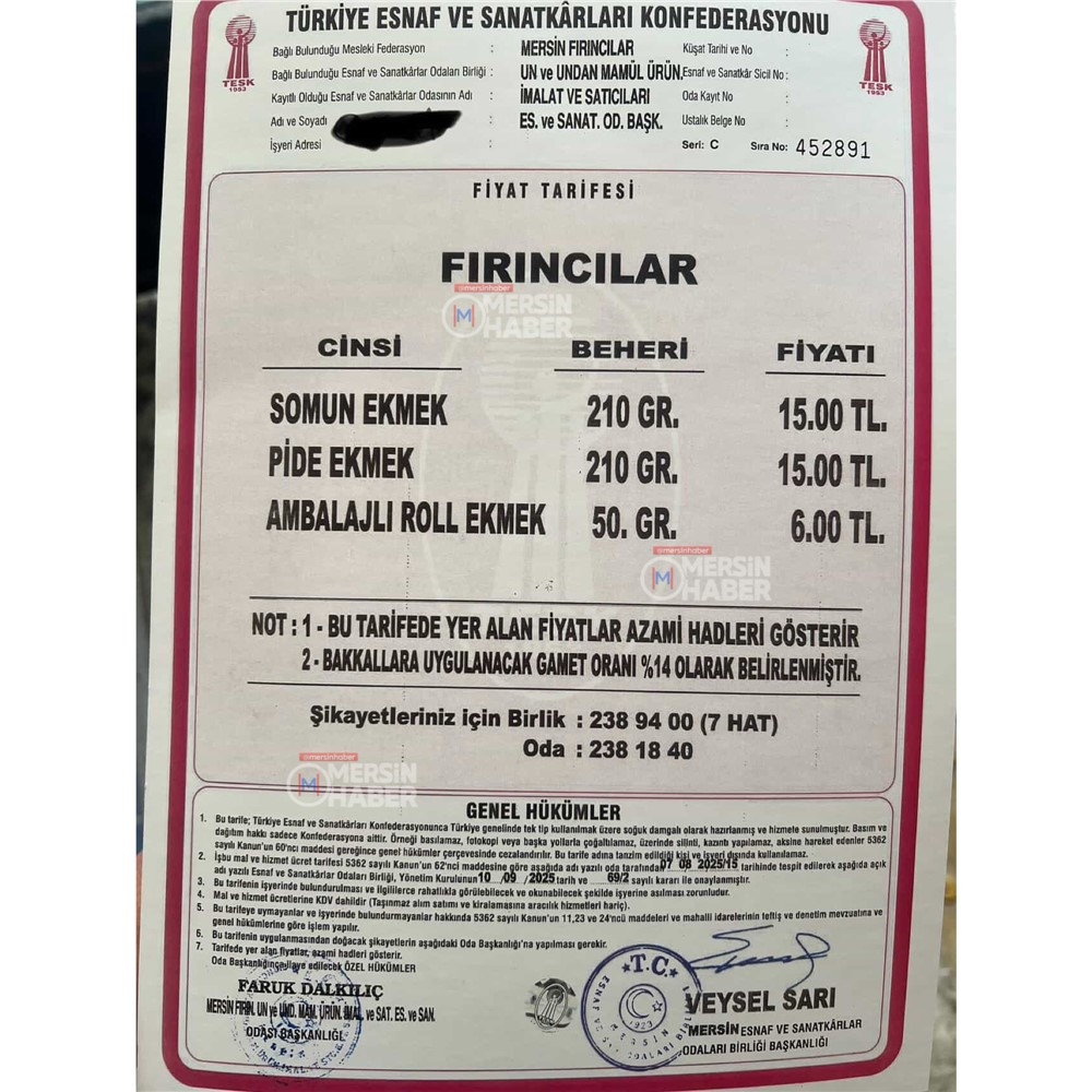 Mersin’de fırıncılar için hazırlanan yeni fiyat tarifesi 13 Eylül 2025 itibarıyla yürürlüğe giriyor. Buna göre 210 gram somun ekmek ve 210 gram pide ekmek 15 TL’den, 50 gram ambalajlı roll ekmek ise 6 TL’den satışa sunulacak.