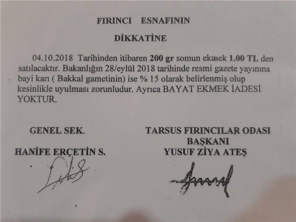 23 Eylül 2018 Pazar günü Mersin genelinde ekmeğe zam gelmiş ve 200 gram somun ekmeğin fiyatı 1.25 TL olarak belirlenmişti. Önceki günlerde, Ticaret Bakanlığının Ankara'da zammı geri çekmesinin ardından alınan bu kararın diğer bölgeler için geçerli olduğu açıklanmasının ardından Mersin'de yapılan zam geri çekildi.