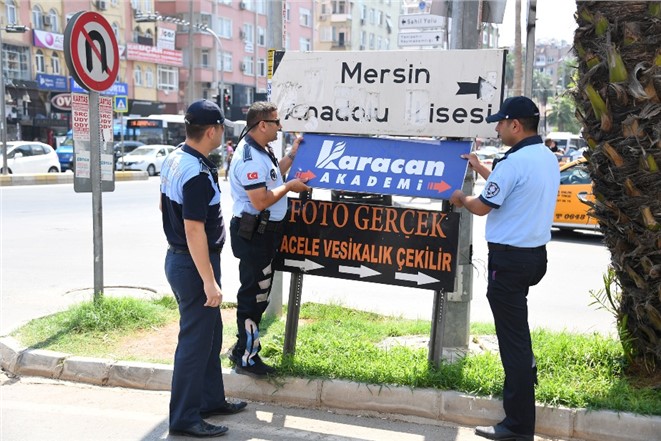 Mersin genelinde ana caddelerde, yol kenarlarında yer alan irili ufaklı reklam tabelaları, görüntü kirliliğine sebebiyet vermesi nedeniyle Mersin Büyükşehir Belediyesi zabıta ekiplerince düzenlenen çalışma ile kaldırıldı.