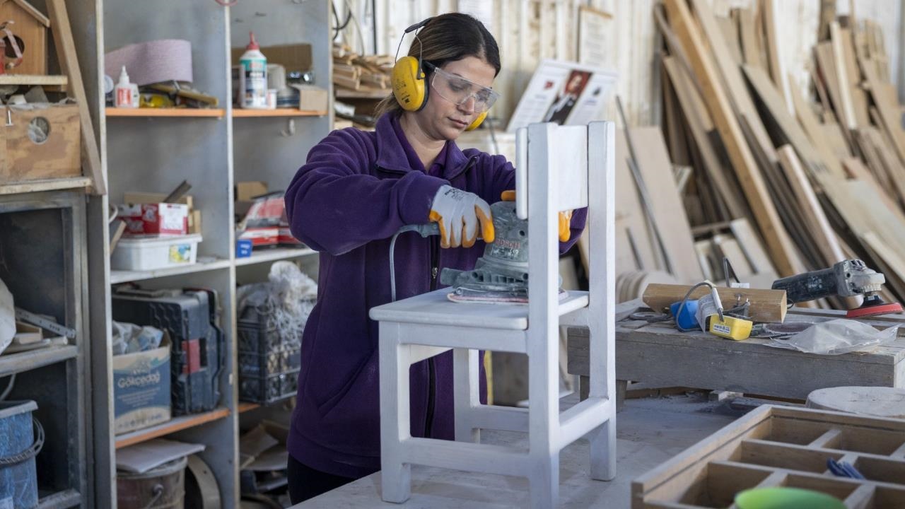 Mersin Büyükşehir Belediyesi Kadın ve Aile Hizmetleri Dairesi Başkanlığı’nda görev yapan Marangoz Ustası Teslime Özdemir, Tarsus Gençlik Kampı Geri Dönüşüm Atölyesi’nde 2020’den bu yana, birimlerin malzemelerini ürettiklerini anlatarak, “Birimlerimizden gelen ürünlerin bakım, onlarım ve tamir işlerini bu atölyede yapıyoruz. Geri Dönüşüm Atölyemizde; birimlerimizin ihtiyacı olan masa, sandalye, dolap ve büro malzemelerinden tutun, akla gelecek her türlü ihtiyacı üretiyoruz. 2020’den 2025 yılına kadar Daire Başkanlığımıza bağlı 40 birim açıldı. Bu birimlerden 38’inin malzemeleri burada üretildi. Diğer dairelerden gelen talepleri de elimizden geldiğince yerine getirmeye çalışıyoruz” ifadelerini kullandı.