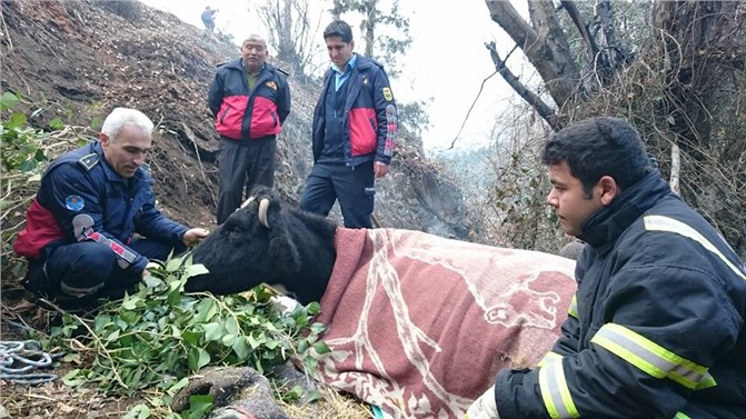 Olay yerine gelen itfaiye ekipleri, oldukça yorgun ove aynı zamanda hamile olan ineği önce topladıkları tazı yapraklar vererek beslediler. Ekipler yaklaşık 150 mere uçurumda bulunan ineğin sağ salim çıkarılması için çalışmalarına devam ediyor.