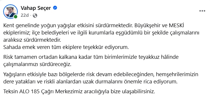 Mersin Büyükşehir Belediye Başkanı Vahap Seçer, sosyal medya hesapları üzerinden yaptığı açıklamada, yağışların kent genelinde sürdüğünü vurguladı. Çalışmaların sadece Büyükşehir bünyesinde değil, MESKİ, ilçe belediyeleri ve diğer ilgili kurumlarla tam bir eşgüdüm içerisinde yürütüldüğünü ifade etti.