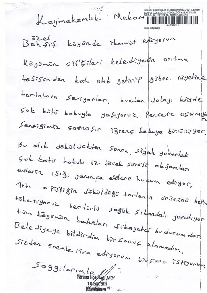 18 Eylül 2019 ‘da verilen dilekçe de, “Özel Bahşiş köyünde (mahalle) ikamet ediyorum. Köyümün çiftçileri belediyenin arıtma tesisinden katı atık getirip gübre niyetine tarlalara seriyorlar.Bundan dolayı köyde çok kötü kokuyla yaşıyoruz. Pencere açamıyoruz. Serdiğimiz çamaşır iğrenç kokulara bürünüyor.Bu atık döküldükten sonra,siyah, yuvarlak çok kötü kokulu bir böcek sürüsü akşamları evlerin ışığı yanınca evlere hücum ediyor. Artı o pisliğin döküldüğü tarlanın ürününü hepimiz tüketiyoruz. Her türlü sağlık skandalı yaratıyor. Tüm köyümün kadınları şikayetçi bu durumdan. Belediyeye bildirdim bir sonuç alamadım. Sizden önemle rica ediyorum bir çare istiyorum saygılarımla” ifadeleri kullanılarak yetkililerin çözüm bulunmasını istediler.