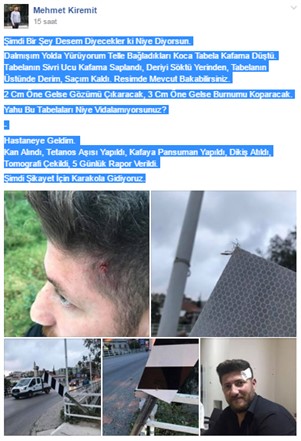 Neye uğradığını şaşıran bir anda kanlar içinde kaldı. Konuyla ilgili sosyal medyada yöneticisi olduğu Mersin Bilinçli Sürücü Sayfasında tepki gösteren Kiremit şu ifadeleri kullandı. "Yolda yürüyorum, telle bağladıkları koca tabela kafama düştü. Tabelanın sivri ucu kafama saplandı, Deriyi söktü yerinden, tabelanın üstünde derim ve saçım kaldı. 2 Cm öne gelse gözümü çıkaracak, 3 Cm öne gelse burnumu koparacak." şeklindekiifadelerde duruma tepki gösterdi.