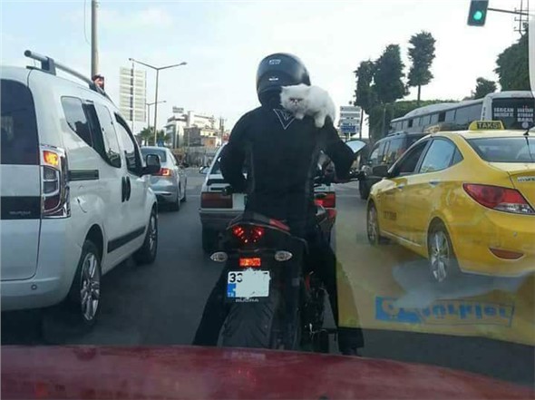 Yolculuk süresince sahibinin omzundan çevreyi gözetleyen kediyi gören diğer sürücüler şaşkına döndü.