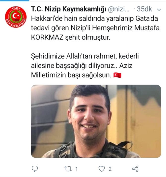 Aslen Gaziantep'in Nizip ilçesinden olan Şehit Mustafa Korkmaz'ın Mersin Mesudiye Mahallesi'nde ikamet ettiği öğrenildi. Konu ile ilgili Nizip Kaymakamlığı resmi Twitter hesabında Kahraman askerimiz Mustafa Korkmaz'ın Şehit olduğunu duyurdu.