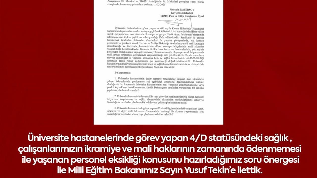 MHP Kayseri Milletvekili Baki Ersoy, üniversite hastanelerinde çalışan ve 696 sayılı Kanun Hükmünde Kararname ile kadroya geçen 4/D statüsündeki sağlık çalışanlarının mali sorunlarını Türkiye Büyük Millet Meclisi gündemine taşıdı. Ersoy, yazılı olarak hazırladığı soru önergesi ile konuyu Milli Eğitim Bakanı Yusuf Tekin’e iletti. Bu önerge, üniversite hastanelerinde görev yapan sağlık personelinin ikramiye ve geriye dönük ücret farklarının zamanında ödenmemesi nedeniyle yaşanan mağduriyetlere dikkat çekmeyi amaçlıyor.
