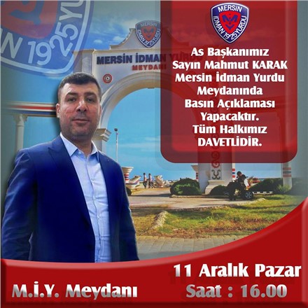 Son gelişmeler üzerine Asbaşkan Mahmut Karak, kulüp içindeki tüm gerçekleri Mersin İdmanyurdu meydanında Mersinlilerin katılacağı geniş katılımlı bir basın toplantısı yaparak açıklayacak. 11 Aralık Pazar Günü saat 16’da gerçekleştirilecek olan basın açıklamasına yoğun bir katılım olması bekleniyor.