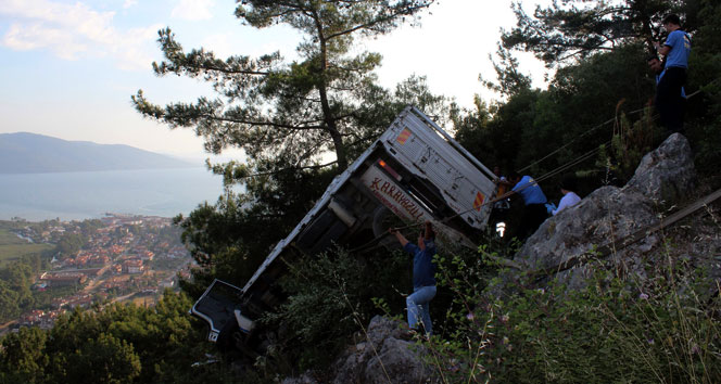 Muğla'da Eren Kılıç (34) yönetimindeki 35 DNF 33 plakalı kamyon, İzmir'den aldığı karpuzları Marmaris'e götürürken Sakartepe rampasında freni boşaldı. Kamyon, Akyaka kavşağına gelmeden önceki son virajda kum yığınına çarparak hızını alamadı ve 10 metrelik uçuruma düştü. Araç kayalıklara çarparak durabildi.