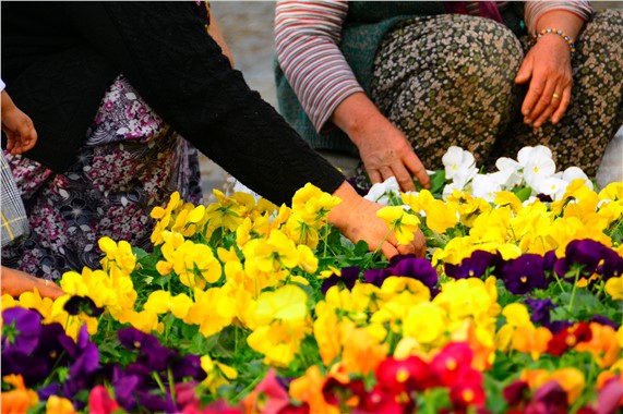 Cemile Gümüş ise evindeki çiçekleri işyerine getirdiğini anlatarak, "Ben oraları süslerken eşim çiçeklerimi satmış. Çok üzülmüştüm. Bu işe ilk o zaman başladık. Ondan sonra çiçek dikip satmaya başladık. Belediyeyle de birlikte yapıyoruz. Kendi yerimiz ayrı, belediyenin yeri ayrı. Seraya sabah girip akşam çıkıyoruz. Güzel bir şey, mutluluk veriyor insana. Psikolojik olarak ayrıca destek veriyor." ifadelerini kullandı.