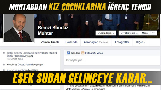Gebze‘nin Arapçeşme Mahallesi Muhtarı Remzi Kandaz, Facebook’ta kız çocuklarına yönelik yaptığı uyarılara uyulmaması halinde döveceğini yazdı.
