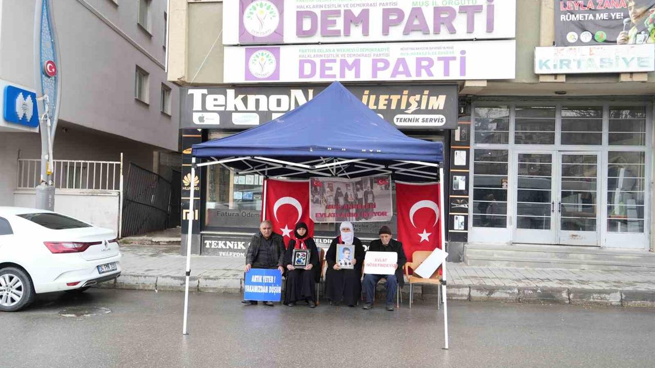 Muş Merkez'de, çocuklarının terör örgütü PKK tarafından dağa götürüldüğünü iddia eden aileler, DEM Parti İl Başkanlığı önünde başlattıkları evlat nöbetini devam ettiriyor. Ellerinde çocuklarının fotoğraflarını tutan anneler ve babalar, "Artık yeter", "Yakamızdan düşün" ve "Anneler direniyor" yazılı pankartlarla seslerini duyurmaya çalışıyor. Zaman zaman duygusal anların yaşandığı eylemde aileler, çocuklarına güvenlik güçlerine teslim olmaları çağrısında bulundu.