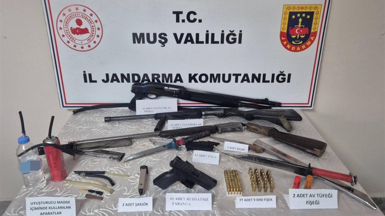 Muş İl Jandarma Komutanlığı, 6136 ve 2521 sayılı kanunlara muhalefet ile TCK-191 kapsamında yürüttüğü çalışmalar sonucunda Varto ilçesinde 2 şüpheliye yönelik adli arama gerçekleştirdi. Arama sırasında şüphelilere ait olan araç, iş yeri ve ek alanlarda yapılan detaylı incelemelerde 3 adet ruhsatsız av tüfeği, 1 adet tabanca, 2 adet tabanca şarjörü, 77 adet tabanca fişeği, 2 adet av tüfeği fişeği, 3 adet pala, 1 adet bıçak ile 9 adet uyuşturucu madde kullanım aparatı ele geçirildi. Ele geçirilen tüm malzemelere el konulurken, gözaltına alınan 2 şüpheli hakkında cumhuriyet savcısının talimatları doğrultusunda adli tahkikat başlatıldı.