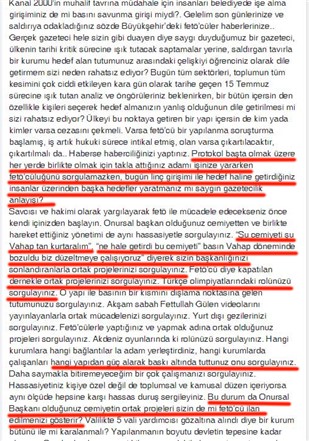 Savcısı ve hakimi olarak yargılayarak FETÖ ile mücadele edecekseniz önce kendi içinizden başlayın. Onursal başkan olduğunuz cemiyetten ve birlikte hareket ettiğiniz yönetimi de aynı hassasiyetle sorgulayınız. “Şu cemiyeti şu Vahap tan kurtaralım”, “ne hale getirdi bu cemiyeti” basın Vahap döneminde bozuldu biz düzeltmeye çalışıyoruz” diyerek sizin başkanlığınızı sonlandıranlarla ortak projelerinizi sorgulayınız. FETÖ'cü diye kapatılan dernekle ortak projelerinizi sorgulayınız. Türkçe olimpiyatlarındaki rolünüzü sorgulayınız. O yapı ile basının bir kısmını dışlama noktasına gelen tutumunuzu sorgulayınız. Akşam sabah Fettullah Gülen videolarını yayınlayanlarla ortak mücadelenizi sorgulayınız. Yurt dışı gezilerinizi sorgulayınız. FETÖ'cülerle yaptığınız ve yapmak adına ortak olduğunuz projeleri sorgulayınız. Akdeniz oyunlarında ki rolünüzü sorgulayınız. Hangi kurumlara hangi bağlantılar la adam yerleştirdiniz, hangi kurumlarda çalışanları hangi yapıdan güç alarak baskı altında tuttunuz onu sorgulayınız. Daha saymakla bitiremeyeceğim bir çok çalışmanızı sorgulayınız. Hassasiyetiniz kişiye özel değil de toplumsal ve kamusal düzen içeriyorsa aynı ölçüde hepsine karşı hassas duruş sergileyiniz. Bu durum da Onursal Başkanı olduğunuz cemiyetin ortak projeleri sizin de mi FETÖ'cü ilan edilmenizi gösterir? Valilikte 5 vali yardımcısı gözaltına alındı diye bir kurum bütünü ile mi karalanmalı? Yapılanmanın boyutu devletin tepesine kadar ulaşmış, Cumhurbaşkanı yaveri bile yapıya dahil olmuş, siz neyin, nasıl mücadelesindesiniz? Dün seçim kampanyalarında birlikteydiniz ve sınırsız destek verdiniz. O halde FETÖ'cü bir yapı vardı, neden FETÖ'cü bir yapıyı dün desteklediniz de bugün hedef alıyorsunuz? Aynı kadroda daire başkanı olarak devam etseydiniz, siz de A takımı olarak aynı yapıda mı olacaktınız?