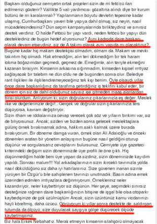 Bugüne kadar hiç makam destekçisi olmadım, olmam da. Makam ve mevki takıntım hiç olmadı. Hak etmediğim, alın teri dökmediğim bir tek haram lokma boğazımdan geçmedi, geçmez de. Emeğimle, alın teriyle ekmeğini kazanan birisiyim. Kimsenin arkasına sığınmadım, kimseden kişisel imtiyaz sağlayacak bir talebim ne dün oldu ne de bugünden sonra olur. Belediye rant ilişkileri ile ilişkilendiremeyeceğiniz tek kişi benim. Öyle olsaydı yıllar önce daire başkanlığınız da tarafıma getirdiğiniz iş teklifini kabul eder, bir dönem için siz de dahil olduğunuz sayısız işe gitmeden maaş alanlardan birisi olurdum. Anlıyorum ki; sizin doğrularınız çıkarlarınızla eş değer. Meslek ilke ve değerlerinizle değil!.. Gerçek ve doğrular sizin çıkarlarınızla ters düşüyorsa, kavram değiştiriyor.