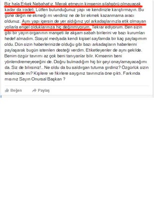 Biz hala Erkek Nebahat'ız. Merak etmeyin kimsenin silahşörü olmayacak kadar da iradeli. Lütfen bulunduğunuz yapı ve kendinizle karıştırmayın. Bu güne değin ne ekmeği mi verdiniz ne de bir ekmek kazanmama aracı oldunuz. Aynı yapı içersin de yer aldığınız yol arkadaşlarınızla etik olmayan yollarla engel olduklarınıza hiç değinmiyorum. Tekrar ediyorum. Ben sizin gibi bir yayın organının manşeti ile akşam sabah birilerini ve bazı kurumları hedef almadım. Sosyal medyada kendi kişisel sayfamda bir kaç paylaşımım oldu. Dün sizin haberlerinizde olduğu gibi bazı arkadaşların haberlerini paylaşarak bugün istenilen desteği verdim. Etiketleyenler de aynı şekilde. Benim özgür tavrımı az çok beni tanıyanlar bilir. Kimsenin beni yönlendiremeyeceğini de. Doğru bulmadığım hiç bir şeyi onaylamayacağımı da. Siz de bilirsiniz!.. Ne oldu da bu saldırgan tutuma girdiniz? Özgürlük sizin tekelinizde mi? Kişilere ve fikirlere saygınız tavrınızla öne çıktı. Farkında mısınız Sayın Onursal Başkan ?