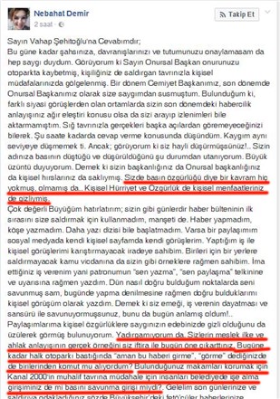 Bu güne kadar şahsınıza, davranışlarınızı ve tutumunuzu onaylamasam da hep saygı duydum. Görüyorum ki Sayın Onursal Başkan onurunuzu otoparkta kaybetmiş, kişiliğiniz de saldırgan tavrınızla kişisel müdafaalarınızda gölgelenmiş. Bir dönem Cemiyet Başkanımız, son dönemde Onursal Başkanımız olarak size saygımdan susmuştum. Bulunduğum ki, farklı siyasi görüşlerden olan ortamlarda sizin son dönemdeki habercilik anlayışınız ağır eleştiri konusu olsa da sizi arayıp izlenimleri bile aktarmamıştım. Sığ tavrınızla gerçekleri başka açılardan göremeyeceğinizi bilerek. Şu saate kadarda cevap verme konusunda düşündüm. Kaygım aynı seviyeye düşmemek ti. Ancak; görüyorum ki siz hayli düşürmüşsünüz!.. Sizin adınıza basının düştüğü ve düşürüldüğünü şu durumdan utanıyorum. Büyük üzüntü duyuyorum. Demek ki sizin başkanlığınız da Onursal başkanlığınız da kişisel hırslarınız da saklıymış. Sizde basın özgürlüğü diye bir kavram hiç yokmuş, olmamış da.. Kişisel Hürriyet ve Özgürlük de kişisel menfaatleriniz de gizliymiş.