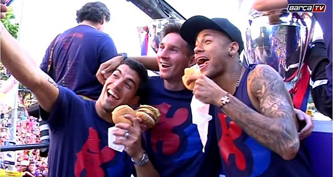 La Liga ve Kral Kupası şampiyonluğu ile UEFA Şampiyonlar Ligi zaferini kutlayan Barcelona, sezonu 3 kupayla kapattı. Kutlamalar sırasında, Brezilyalı yıldız Neymar, üstü açık otobüsten taraftarlara seslenerek karnının acıktığını belirtti ve hamburger istedi. Taraftarlardan aldığı hamburgerleri, takım arkadaşları Messi ve Suarez ile paylaşan Neymar, 122 gol atan ünlü üçlü ile birlikte bu anı ölümsüzleştirmek için fotoğraf çektirdi.