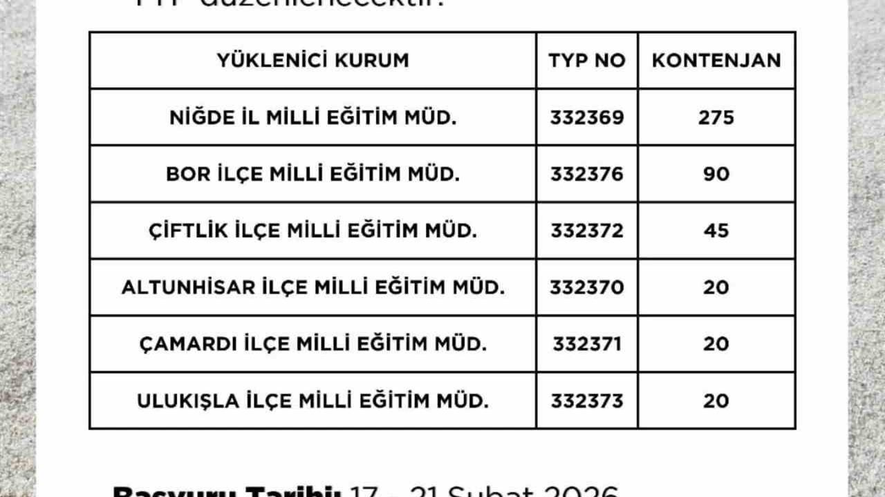 Niğde'de okullarda temizlik ve bakım hizmetleri için 470 kişilik TYP alımı yapılacağı açıklandı. Başvurular 17 - 21 Şubat 2026 tarihleri arasında kabul edilecek.