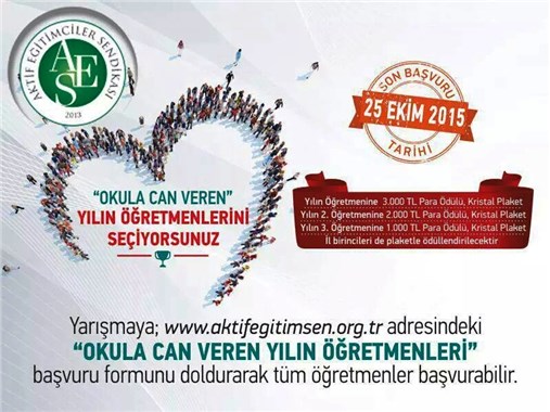 Zor, yarışmaya www.aktifegitimsen.org.tr adresinde bulunan 'Okula Can Veren Yılın Öğretmenleri' aday formunu 28 Eylül - 25 Ekim 2015 tarihleri arasında dolduran tüm eğitimcilerin başvuru yapabileceğini ifade etti.