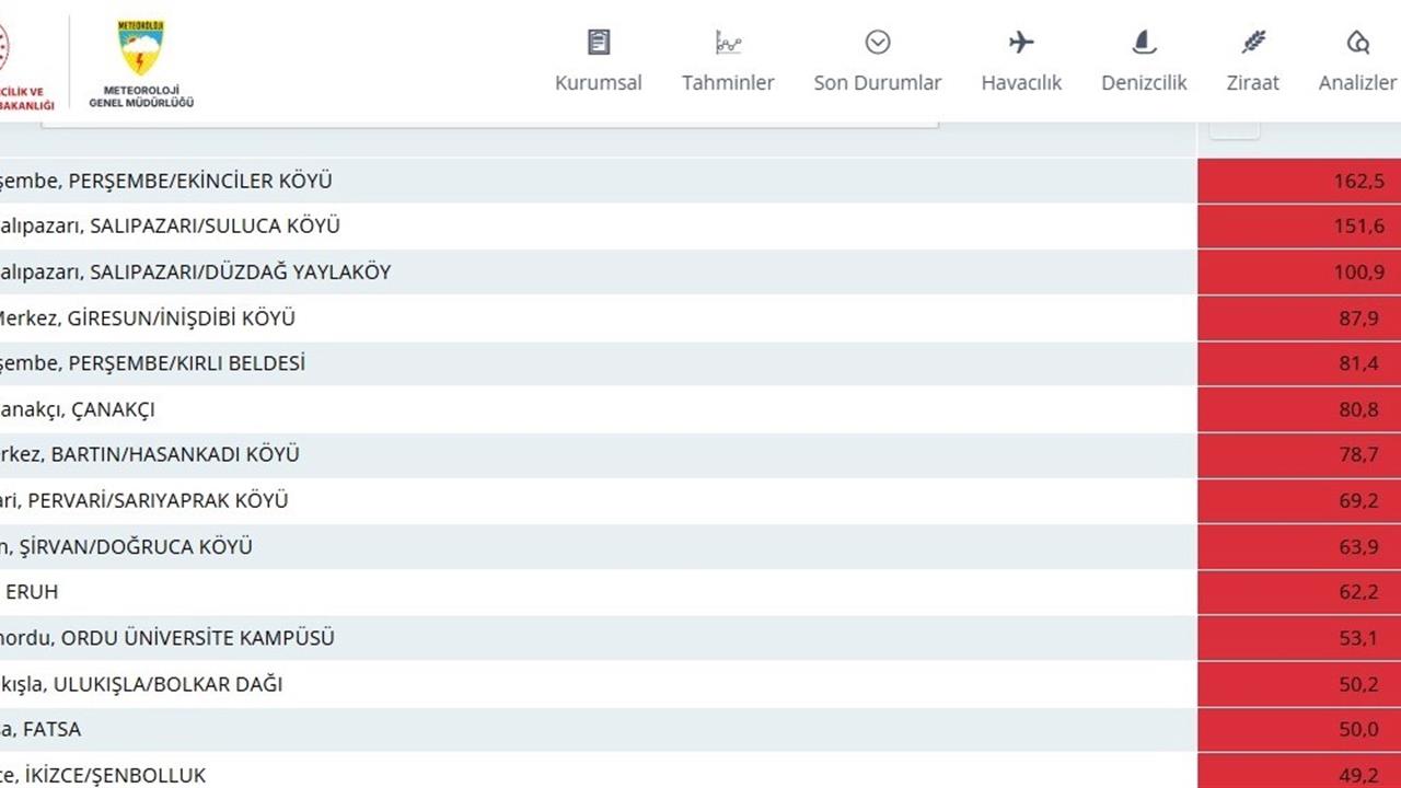 Meteoroloji Genel Müdürlüğü (MGM) tarafından yayımlanan verilere göre, 26 Şubat saat 06.00 ile 27 Şubat saat 06.00 arasında Türkiye genelinde ölçülen yağış miktarları belirlendi. Bu rapora göre, son 24 saat içinde en fazla yağışı 162.5 mm ile Ordu’nun Perşembe ilçesine bağlı Ekinciler Mahallesi aldı. İkinci sırada, Samsun’un Salıpazarı ilçesindeki Suluca Mahallesi 151.6 mm yağış ile yer alırken, üçüncü sırada yine Salıpazarı ilçesinin Düzdağ Yaylaköy Mahallesi bulunuyor.