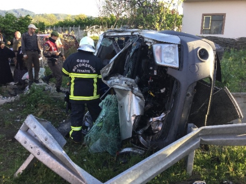 Edinilen bilgilere göre, Ordu'dan Ünye istikametine giden Kadir Babaoğlu (25) yönetimindeki kamyonet, refüje çarptıktan sonra yol kenarındaki bir evin bahçe korkuluklarını kırarak devrildi. Araç hurdaya dönerken, sürücü ve yanında bulunan Veysel Yıldız (25) ile Murat Tekin yaralandı. Kazanın ardından 2 kişi araçta sıkıştı. Olay yerine intikal eden itfaiye ekipleri, yaralıları araçtan çıkararak ambulanslarla Ünye Devlet Hastanesi'ne sevk etti. Yaralıların hayati tehlikesinin bulunmadığı bildirildi.