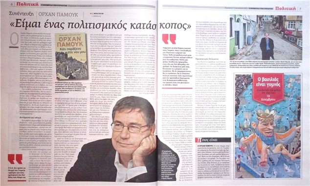 Ünlü yazar Orhan Pamuk, "Kafamda Bir Tuhaflık" (2014) adlı romanının Yunancaya çevrilmesi dolayısıyla düzenlenen etkinlik için geldiği Atina'da Yunan gazetelerine röportaj verdi. Orhan Pamuk, romanları, Türkiye'de ifade ve basın özgürlüğü konusundaki sorunlar, Cumhurbaşkanı Recep Tayyip Erdoğan ve Türkiye ile Avrupa Birliği (AB) sorularını cevaplandırdı. Pamuk'un röportajı, ülkenin çok satan gazetelerinden Ta Nea ve Efimerida ton Sintakton'da ilk sayfadan görüldü. Gazeteler röportaja iki tam sayfa ayırdı.