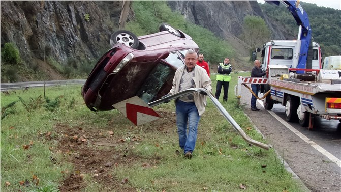 Alınan bilgiye göre, Şule Göktepeli Çolakoğlu (41) yönetimindeki 67 TU 551 plakalı otomobil, Ereğli-Alaplı karayolunun Göktepe Kavşağı mevkisinde sürücünün direksiyon hakimiyetini kaybetmesi sonucu kayarak orta refüje çarptı. Buradaki trafik uyarı levhasını deviren otomobil daha sonra takla atarak refüjde ters dönük vaziyette durabildi.