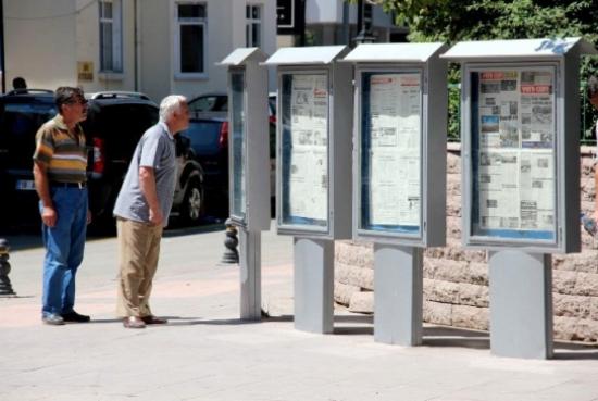Yerel gazete satışının yaygın olarak yapılmadığı Çankırı'da vatandaşlar, 28 yıldır kentin en işlek caddesine kurulan panolardan gazete okuyor.4 yerel gazetenin bulunduğu Çankırı'da yerel gazeteler bayilerde yaygın olarak satılamıyor. Gazete okumak isteyen vatandaşlar, kentin en işlek caddelerinden olan Karatekin Park meydanında kurulan panolardan haber alıyor. Gazetelerden ücretsiz yararlanan vatandaşlar, aynı zamanda alanda bir araya gelerek haberleri değerlendirme fırsatı buluyor.Panolardan gazete okumanın 28 yıllık bir geçmişi olduğunu ifade eden Aydın Demiröz, o dönemlerde gazetecilik yaptığını ve hazırladığı haberlerin daha geniş kitlelere ulaşması için dönemin Belediye Başkanı Mustafa Kale ile birlikte panoları kurduklarını anlattı. Demiröz, 28 yıldır devam eden uygulamanın Çankırılılar için bir geleneğe dönüştüğünü belirtti.Gazete okuma panolarının Türkiye'de başka bir örneğinin olmadığını ifade eden Demiröz, "Sabah erken saatlerde bu panolara 4 yerel gazete asılıyor. Gece geç saatlere kadar vatandaşların okuması için bekletilen gazeteler, diğer gün yenisi ile değiştiriliyor. Bu uygulama benim gazeteci olduğum dönemden beri 28 yıldır aralıksız devam ediyor. Bu uygulama ile hem halkımız gazetelere ulaşıp, kentte olup bitenden haberdar oluyor, hem de yerel gazetelerin okunma sayıları önemli ölçüde artıyor" diye konuştu.Panodaki gazetelerden ücretsiz yararlanan vatandaşlar ise uygulamadan memnun olduklarını belirtiyorlar.