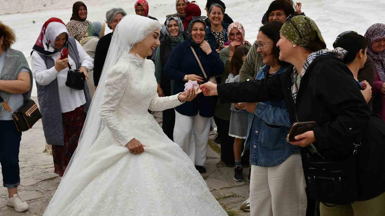 Çiftin fotoğraf çekimi sırasında Düzce'den gelen turist kafilesi, onları görünce iyi dileklerde bulundu ve takı takmaya başladı. Turistlerin çifte takı taktığı anlar, sosyal medyada büyük ilgi topladı. Özel bir hastanede hemşirelik yapan 28 yaşındaki Muhammed Büke, "6 Eylül 2024'te evlenmiştik. Eşim bir daha gelinlik giymek istemişti. Çekim için Pamukkale'yi tercih ettik. Düzceli turistler bizleri görünce ilgilendiler ve takı töreni gibi bir şey yaptılar. Çok güzel bir anıydı" dedi.