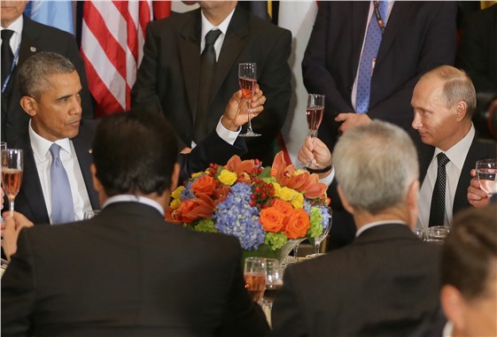 Genel Kurul'da yaptıkları konuşmaların ardından Putin, Obama'nın liderler onuruna verdiği yemekte kadeh kaldırdı.