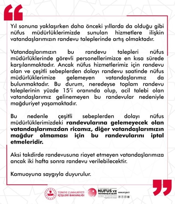 Nüfus ve Vatandaşlık İşleri Genel Müdürlüğü tarafından yapılan paylaşımda "Çeşitli sebeplerden dolayı nüfus müdürlüklerimizdeki randevularına gelemeyecek olan vatandaşlarımız, diğer vatandaşlarımızın mağdur olmaması için bu randevularını iptal etmelidir. Aksi taktirde iki hafta sonra randevu verilebilecektir" denildi.