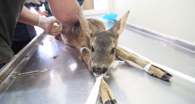 Yavru karaca, burada veteriner hekimler Okray Uçar ve Oğuz Aşkın Torun tarafından, yaklaşık bir saat süren bir ameliyatla tedavi edildi. Veteriner hekim Okray Uçar, yavru karacanın kendilerine getirildiğinde durumunun oldukça kötü olduğunu ifade ederek, “İki parça derin travmatik yarası vardı. İç kas dokusuyla birlikte yaralanmıştı. Dış dokuları onarıp, temizleyip diktik. Genel sağlık durumu iyi, bir problemi yok” dedi.