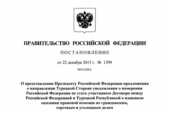 Rusya Başbakanı Medvedev tarafından imzalanan kararname metni Başbakanlık sitesinde yayınlandı. Medvedev anlaşmadan tek taraflı olarak çekilmesi için Devlet Başkanı Vladimir Putin’e başvurdu. Medvedev’in kararnamesinde, Rusya Federasyonu Başbakanlığı olarak Rusya Adalet Bakanlığı’nın sunduğu ve diğer federal mercilerle, Dışişleri Bakanlığı, Başsavcılık ve Soruşturma Komisyonu ile mutabık kalınarak kararın alındığı kaydedildi. Anlaşmadan çekildiğine dair Türkiye tarafının bilgilendirilmesi önerisi yapıldı.