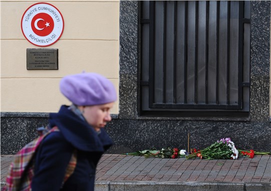 Rusya vatandaşları da Büyükelçilik önüne taziye için çiçek bırakıyor. CİHAN